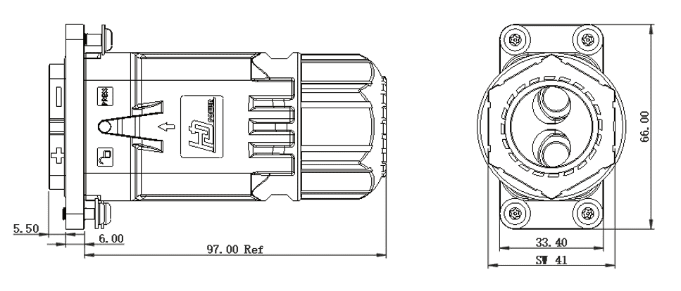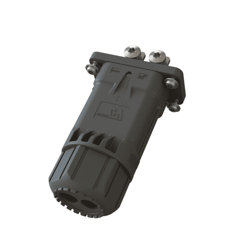Handa HD brand ES 120A 2Pin Terminal Block Connector for battery energy storage system, connecting inverter ES port to the energy storage battery parts, suitable for solar hybird inverters and energy storage inverters. It integrated both positive pole and negative pole 2 pins together with rated amperage 120A, panel inside for both wiring or copper plate connection.